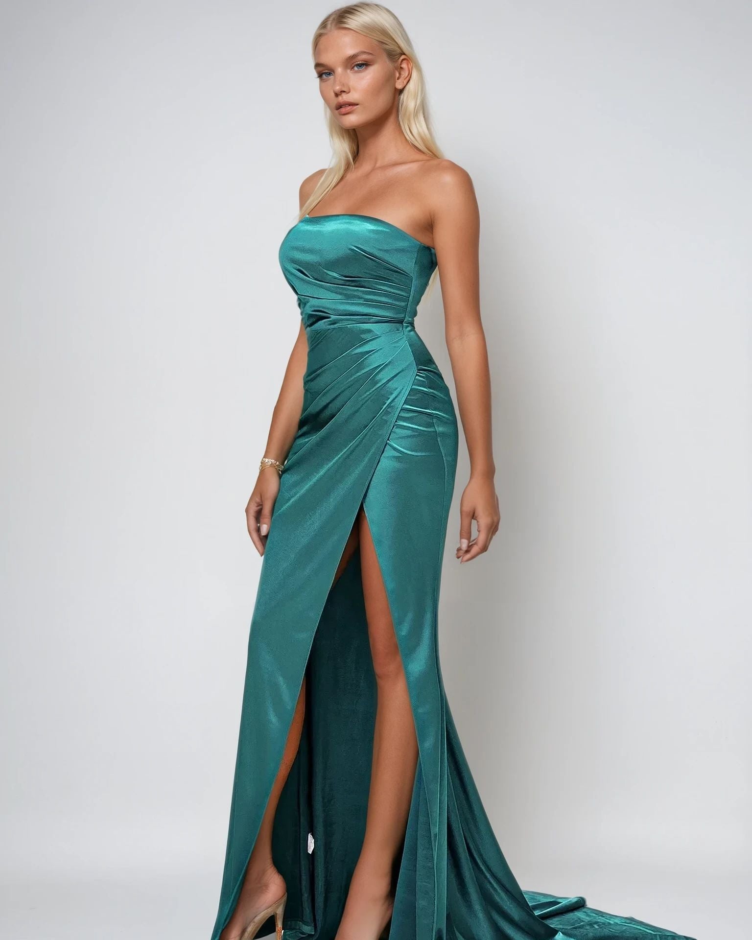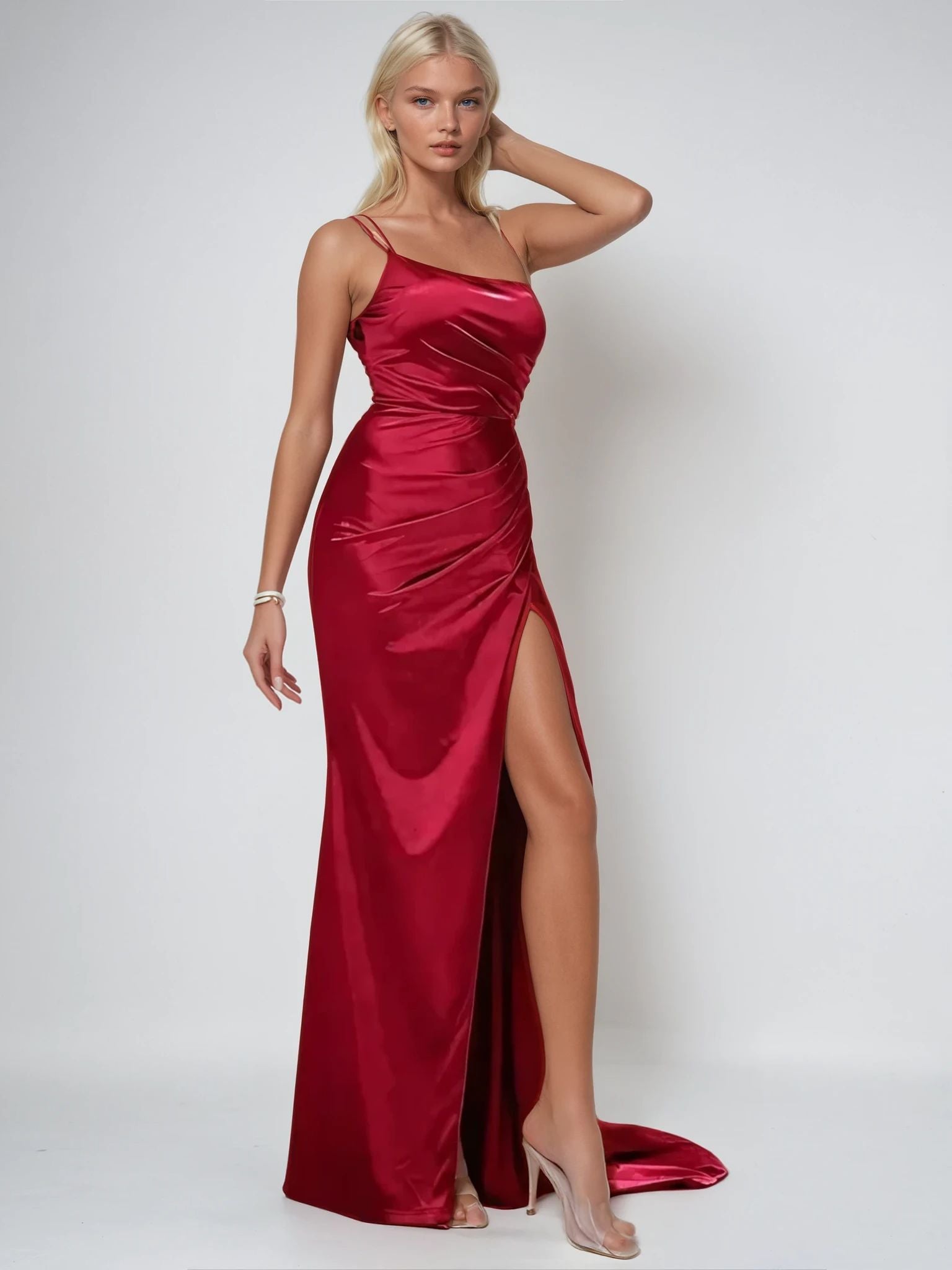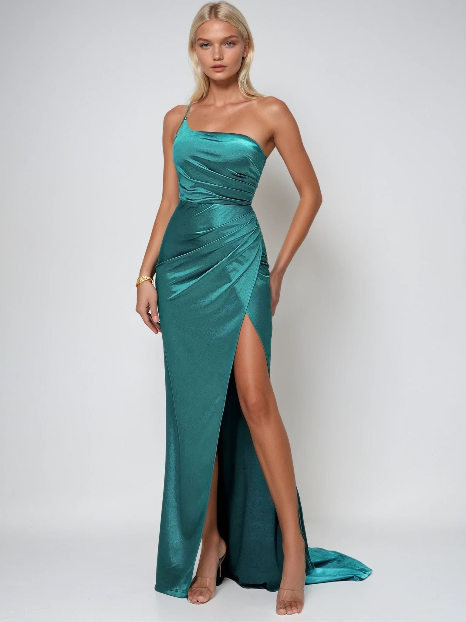 Turn heads with this stunning one-shoulder evening party dress, featuring a chic oblique collar and a sleek sleeveless design. Crafted for a slim fit, this elegant dress highlights your silhouette while the high-slit detail adds a touch of allure. Perfect for formal events, cocktail parties or evening celebrations. This timeless piece combines sophistication and comfort effortlessly. Pair it with your favorite heels and accessories for a show-stopping look.