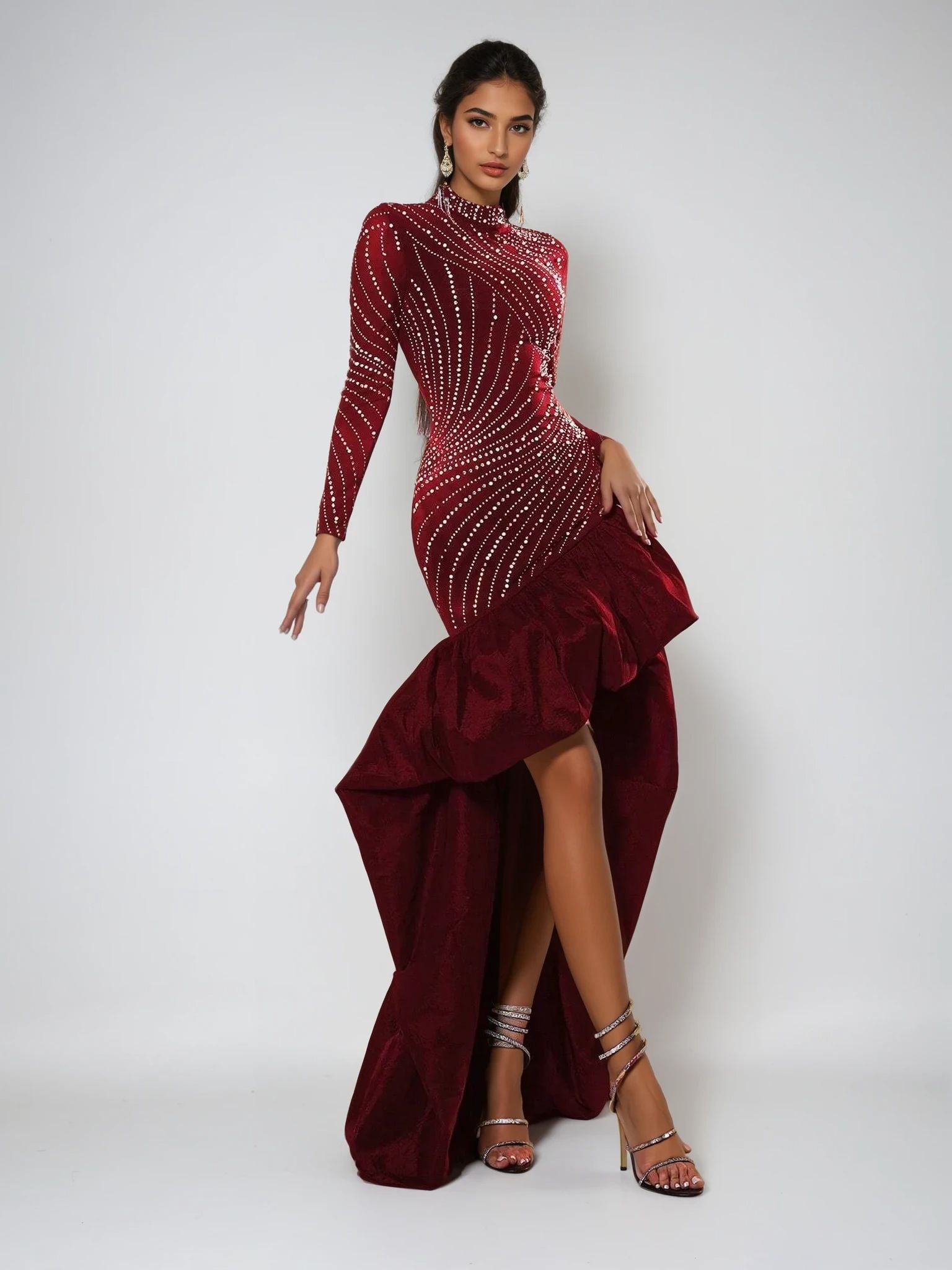 Long Sleeve Sequin Stand Collar Evening Gown – Asymmetrical Hem Wedding Dress for Women