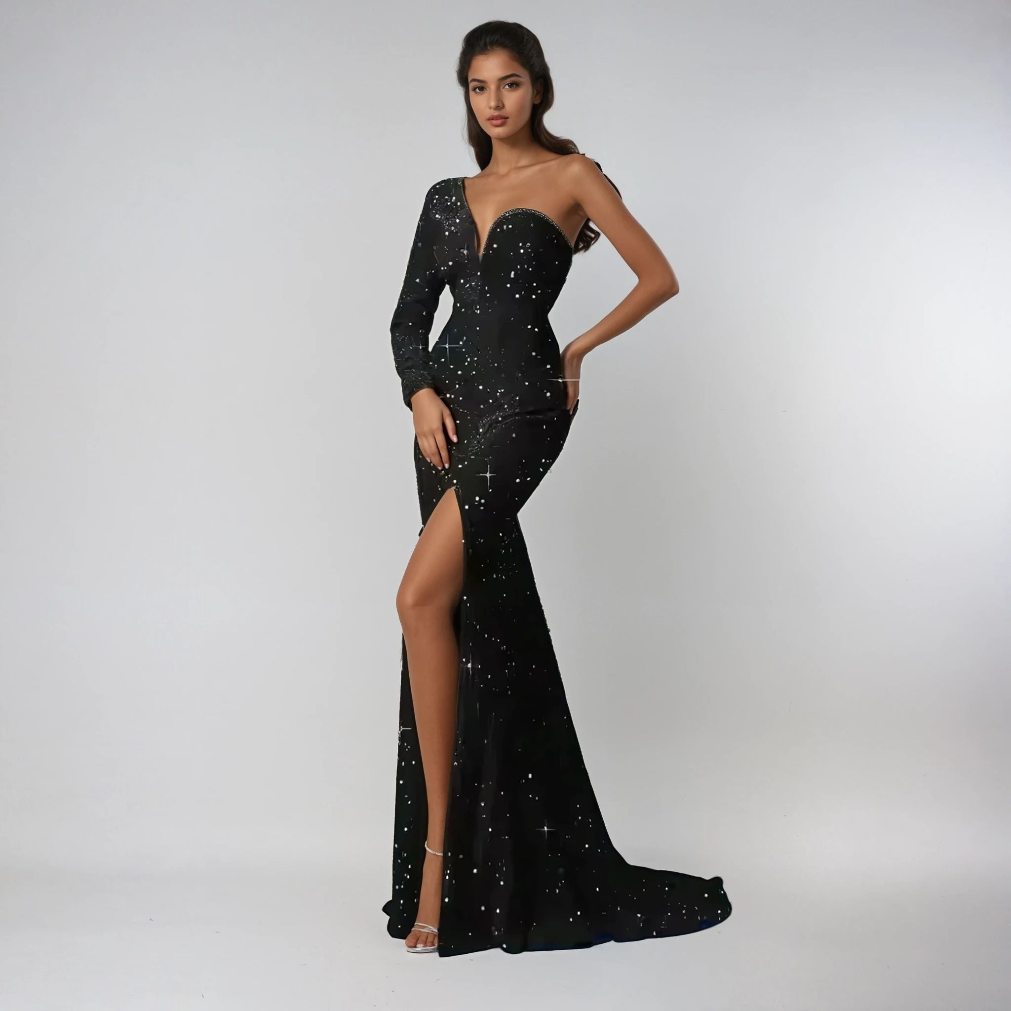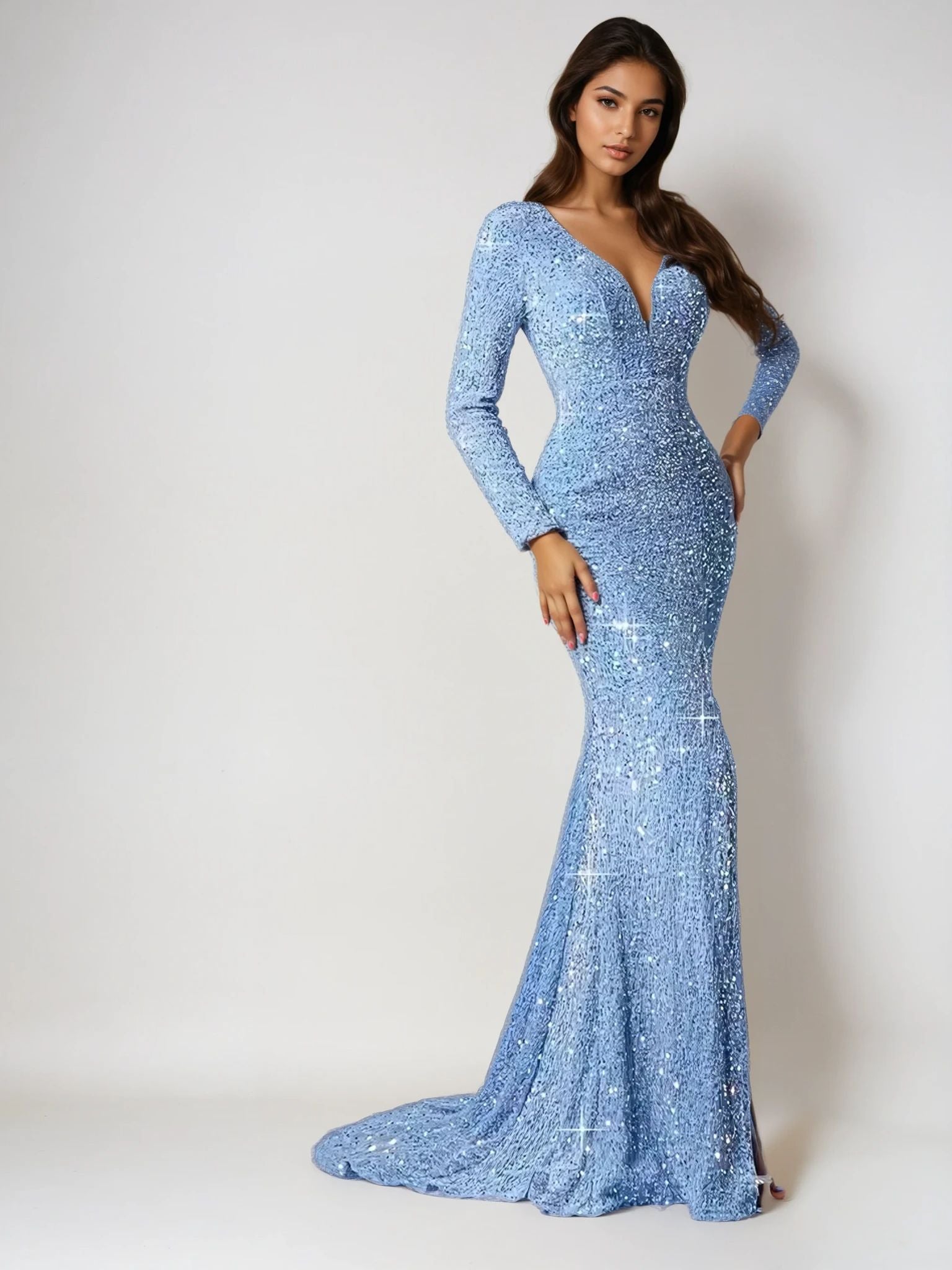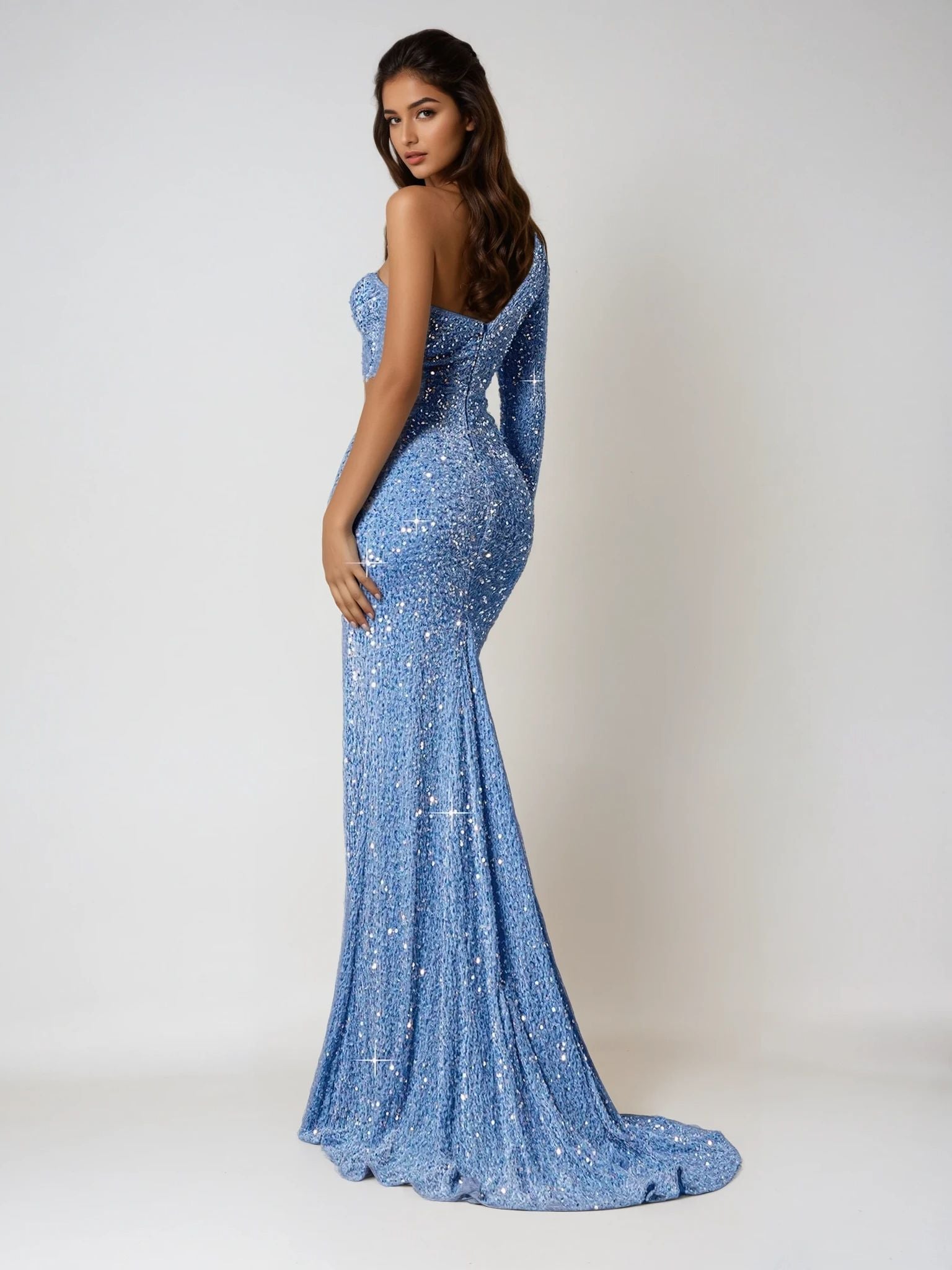 One-Shoulder Blue Sequin Sparkly Slit Fish-Tail Formal Maxi Dress for Women