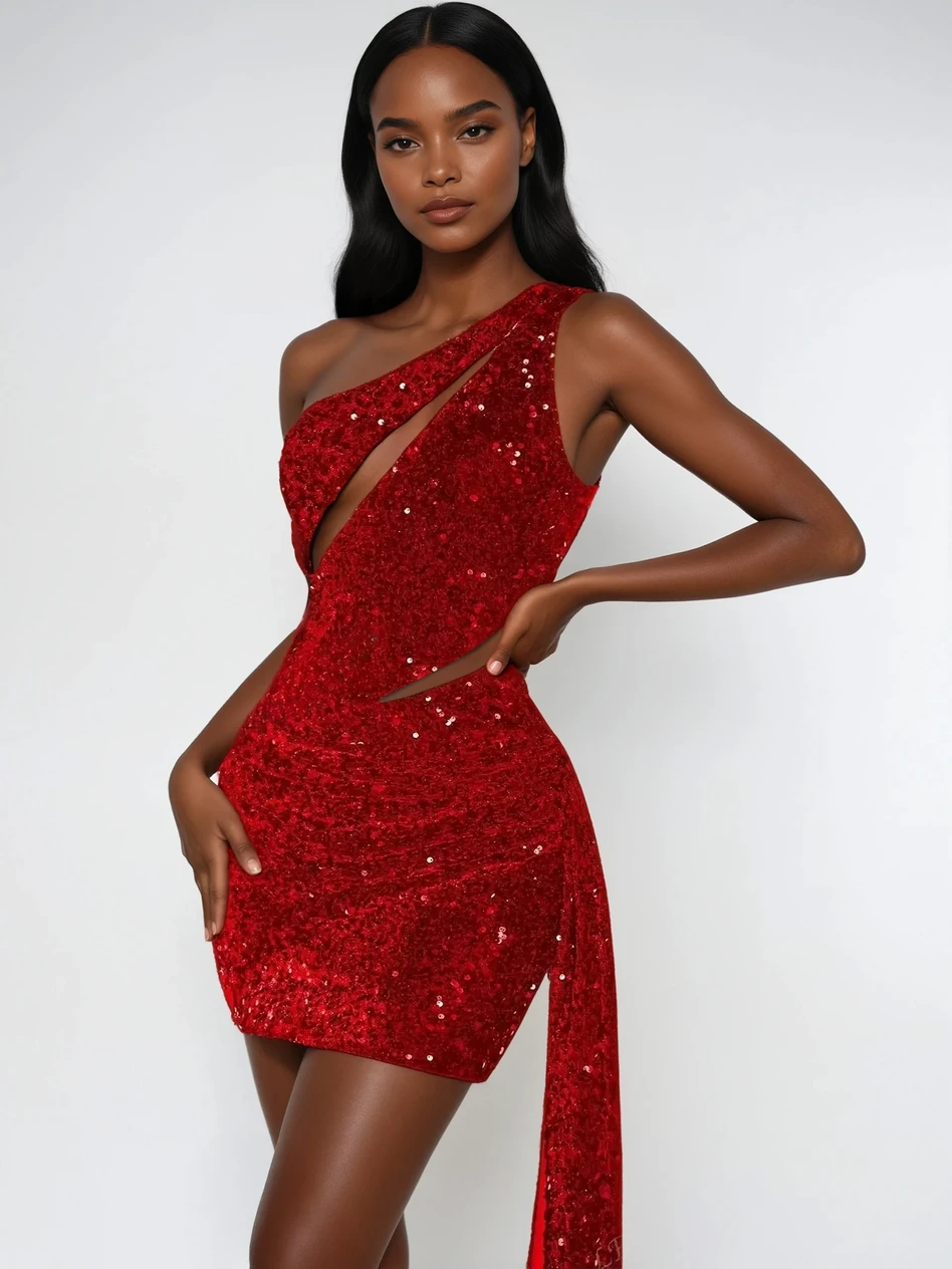 Turn heads with this sexy Red cocktail dress, featuring an elegant asymmetrical neckline and dazzling sequin embellishments with playful tassel details. Perfect for weddings, events or evening parties, this dress combines sophistication with a modern edge. The flattering silhouette ensures you stand out, while the tassels add dynamic movement for a show-stopping look. Pair it with heels and minimal jewelry for a chic and glamorous ensemble.