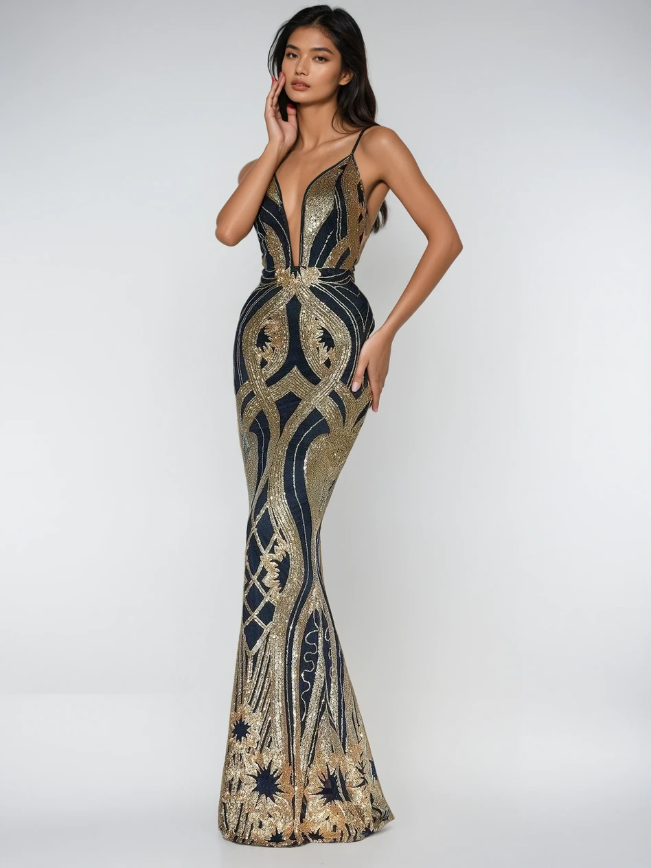 Sexy Deep V-Neck Sequin Backless Long Formal Prom Dress Party Wedding Guest Dress for Women