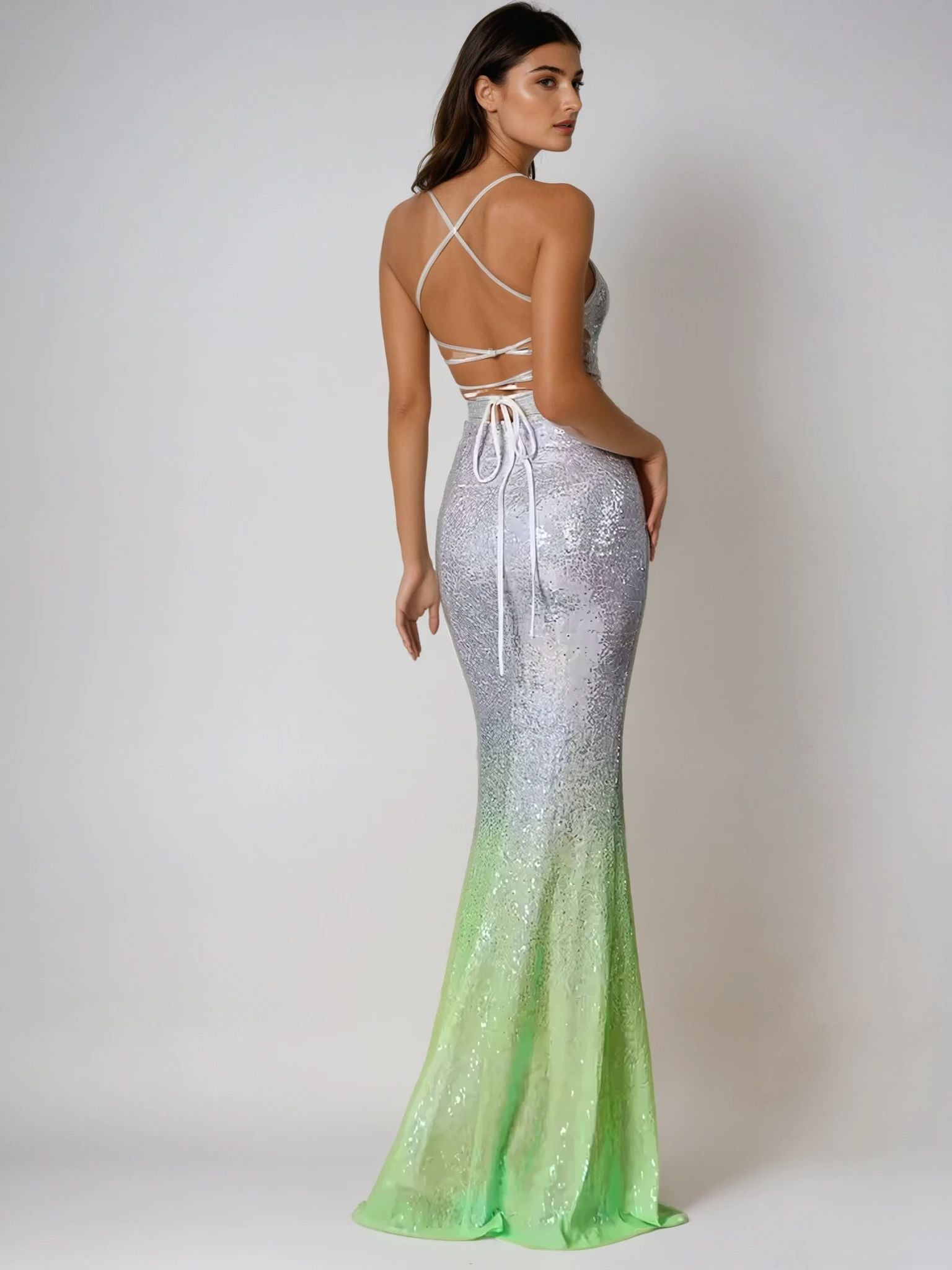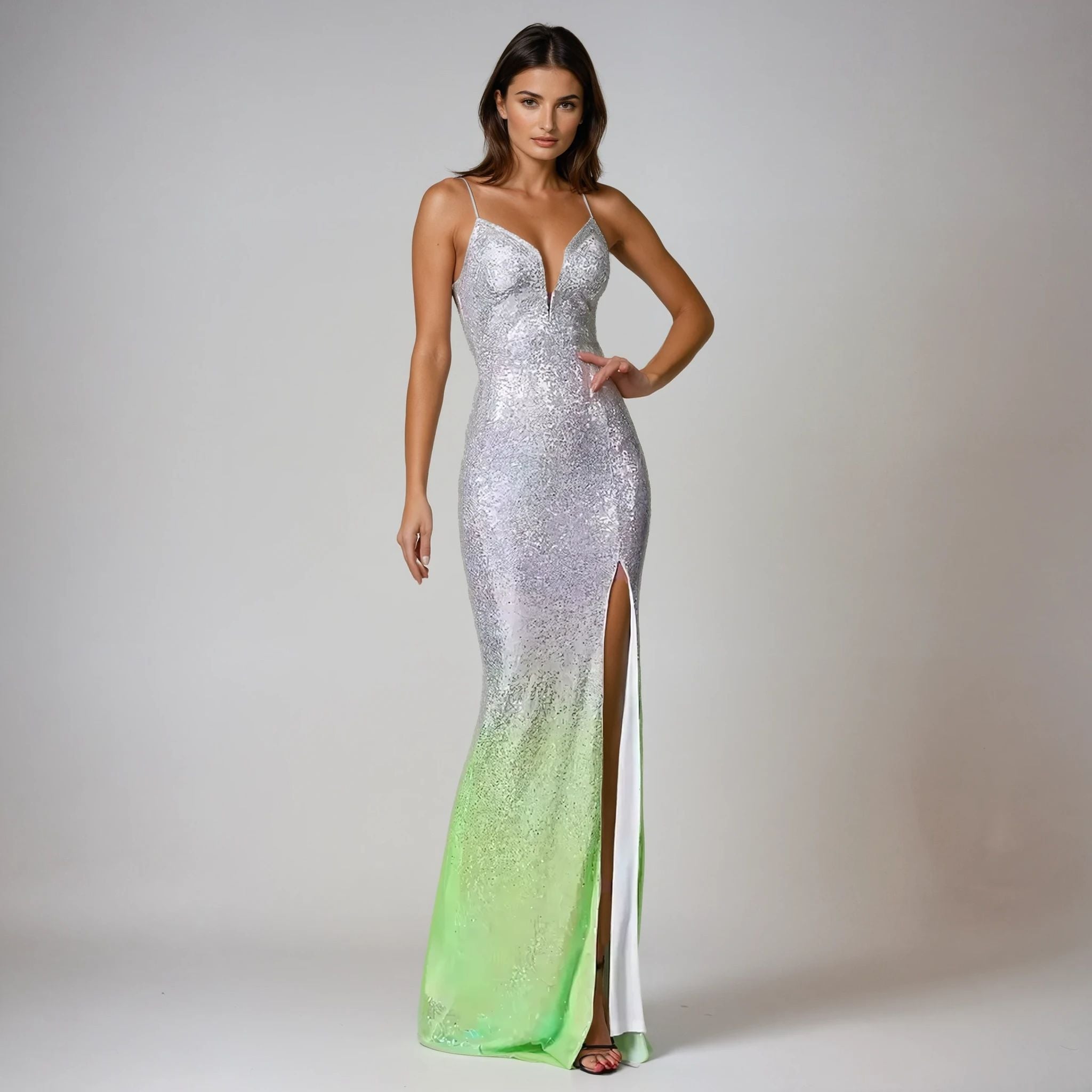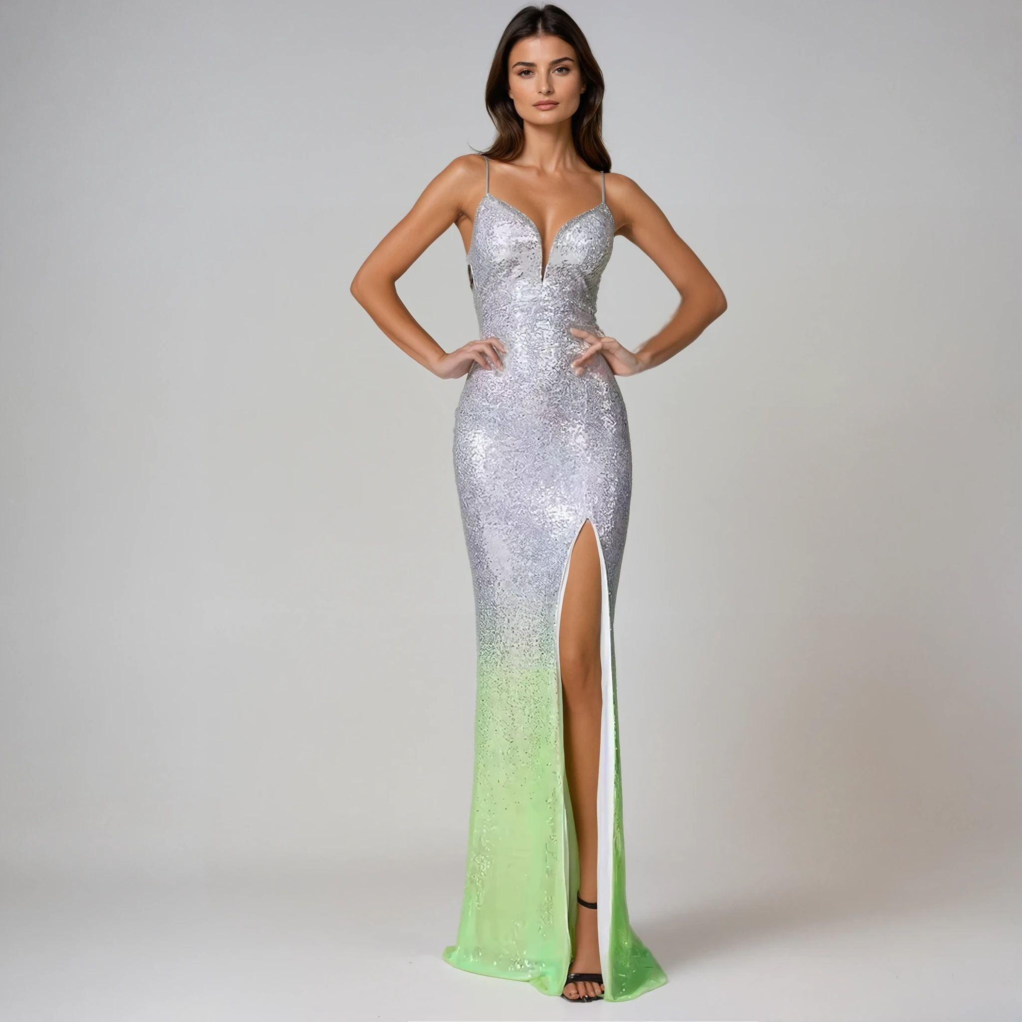 Ombre Silver Sequin Spaghetti Strap High-Slit Evening Gown for Women
