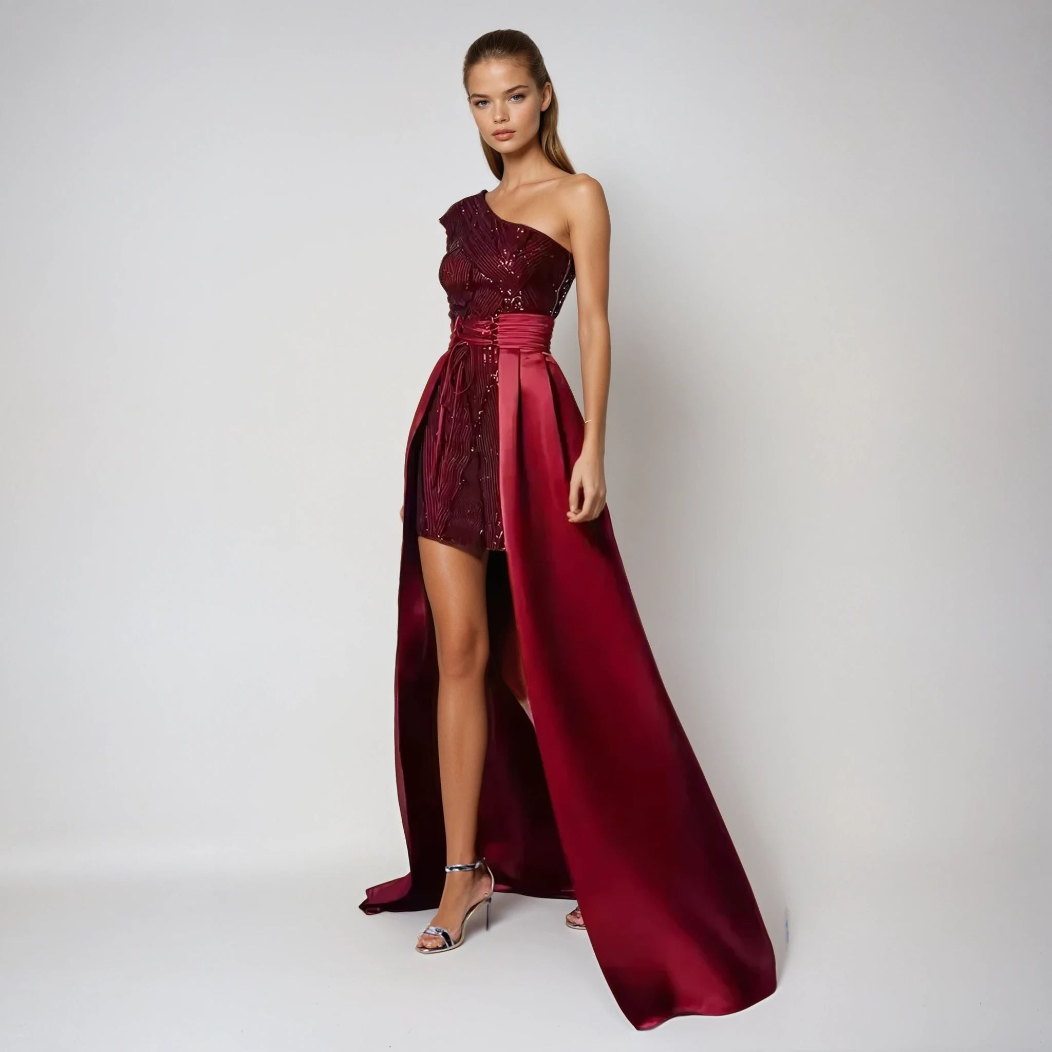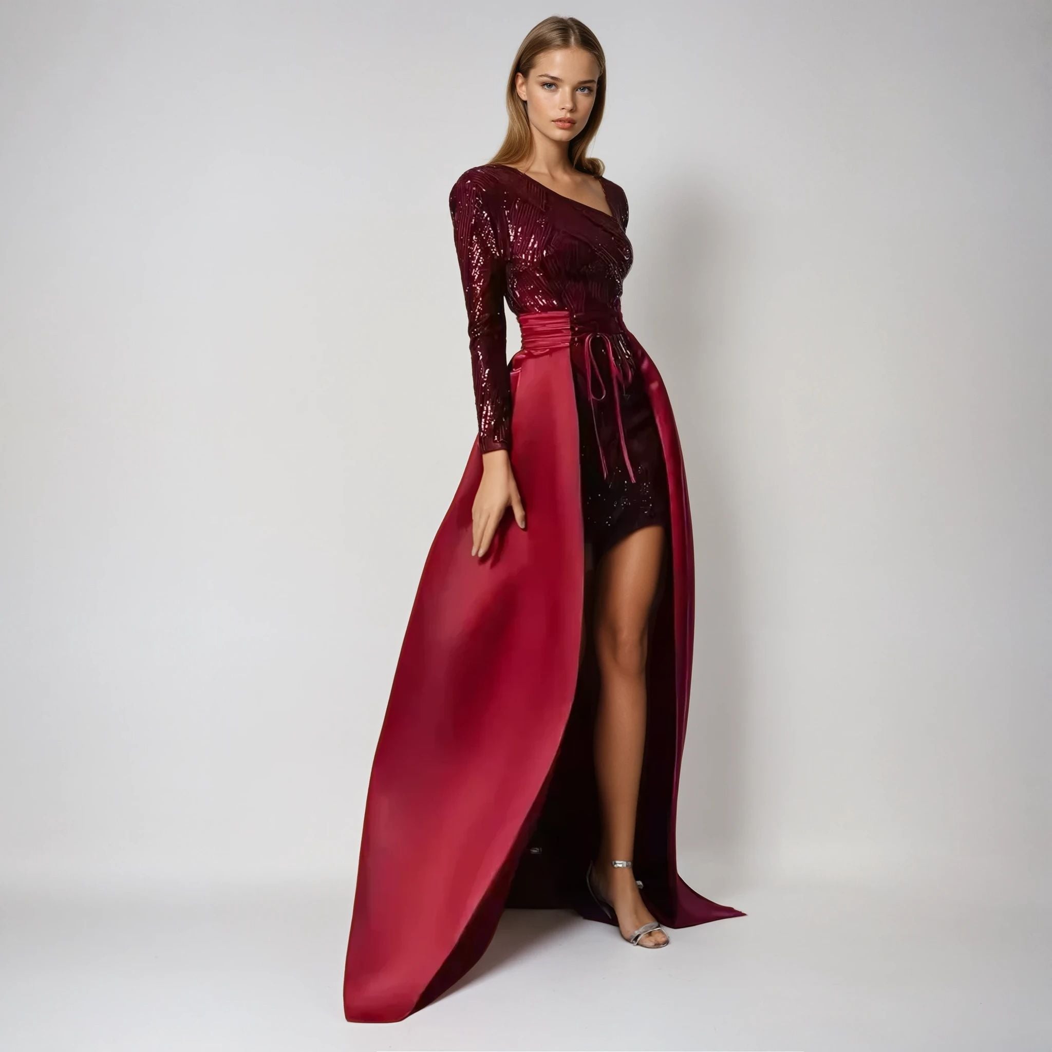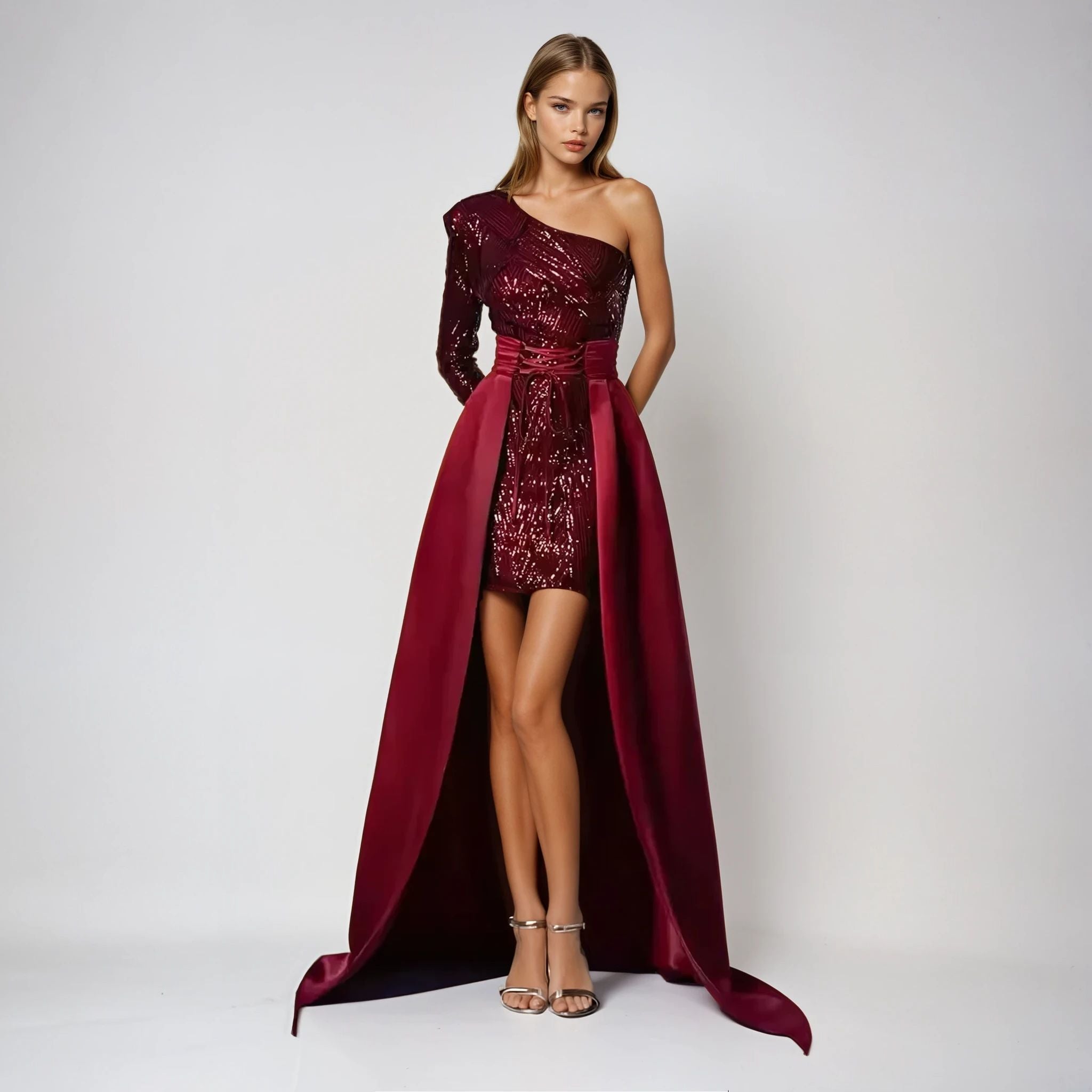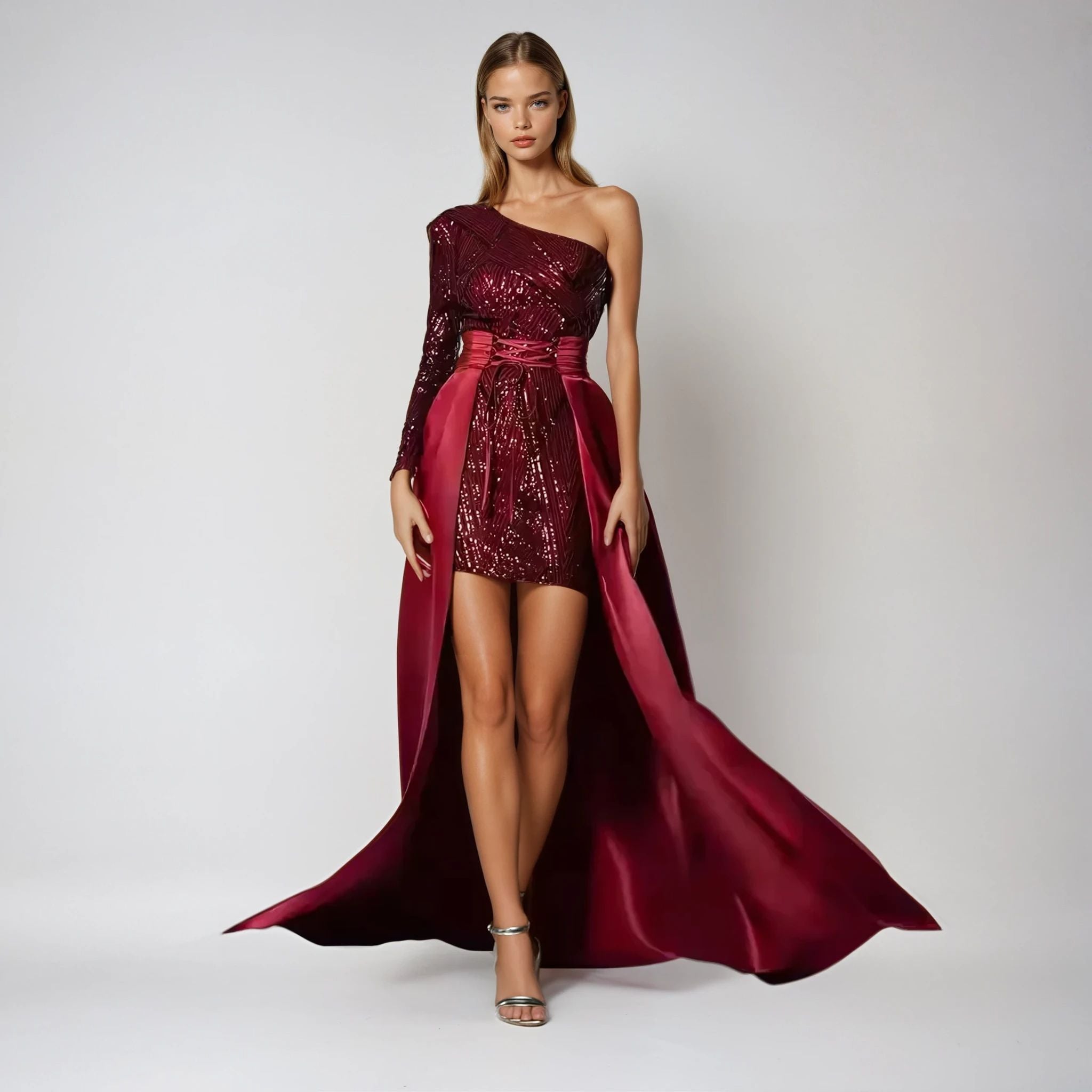 Sexy One-Shoulder Red Glitter Long-Sleeve Mini Evening Party Dress for Women