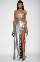 Silver Sequin Off-Shoulder Two-Piece Skirt Set with High Slit for Women