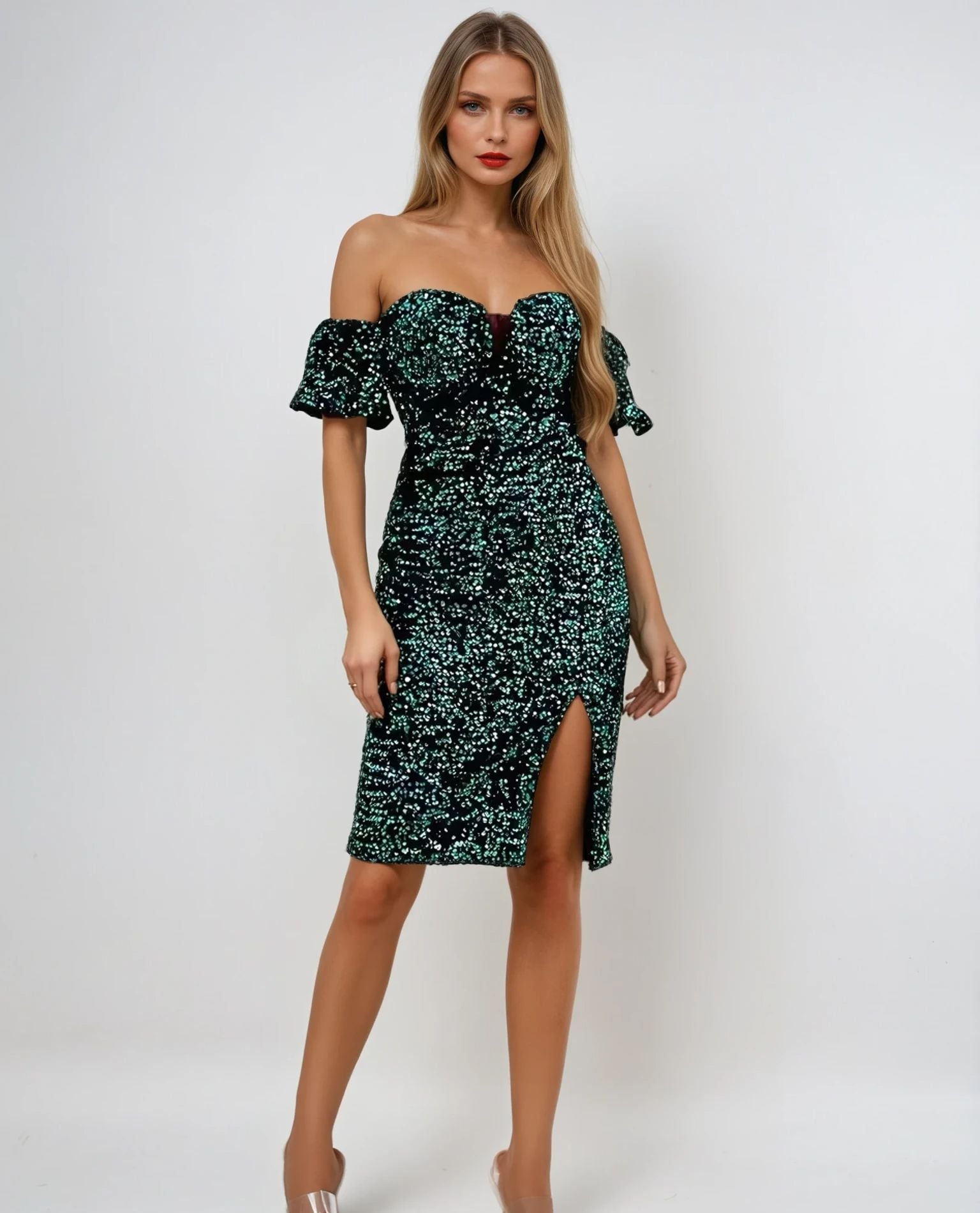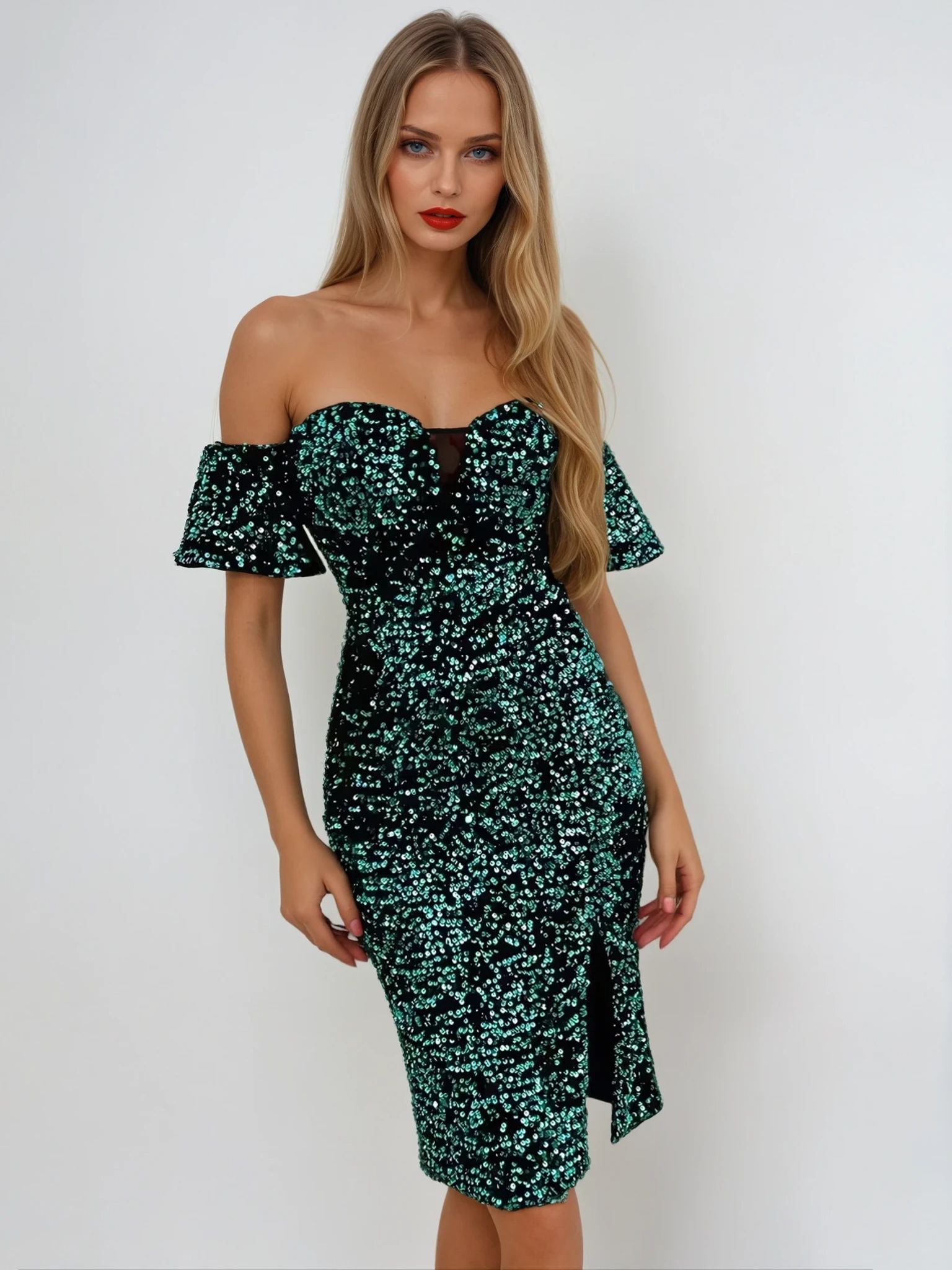 Make a dazzling entrance with this sexy off-shoulder green sequin midi dress, featuring a chic split thigh detail that adds allure to its elegant design.  Perfect for evening parties, formal gatherings or special occasions, this dress exudes glamour and sophistication.  The off-shoulder neckline and shimmering sequins make it a standout choice for women who want to shine.  Pair it with statement heels and subtle accessories for a show-stopping look.