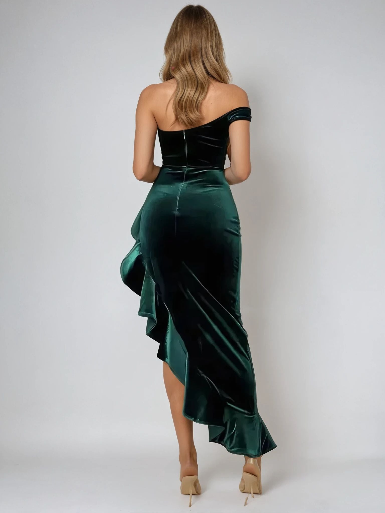 Sexy One-Line Neck Ruffled Irregular Fit Midi Evening Party Dress for Women