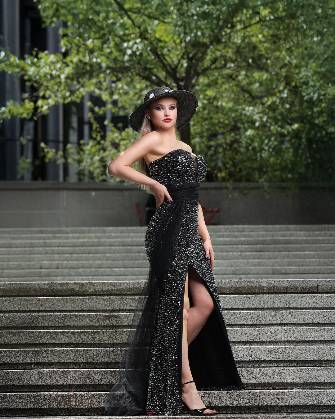 Elegance meets modern glamour in this black sleeveless sequin maxi gown, designed for unforgettable entrances. Featuring a sleek thigh-high slit, shimmering sequin detailing, and a graceful flowing ribbon, this dress is perfect for formal banquets, galas, and red carpet events. The sleeveless design and form-fitting silhouette flatter your shape, while the ribbon adds movement and drama with every step.