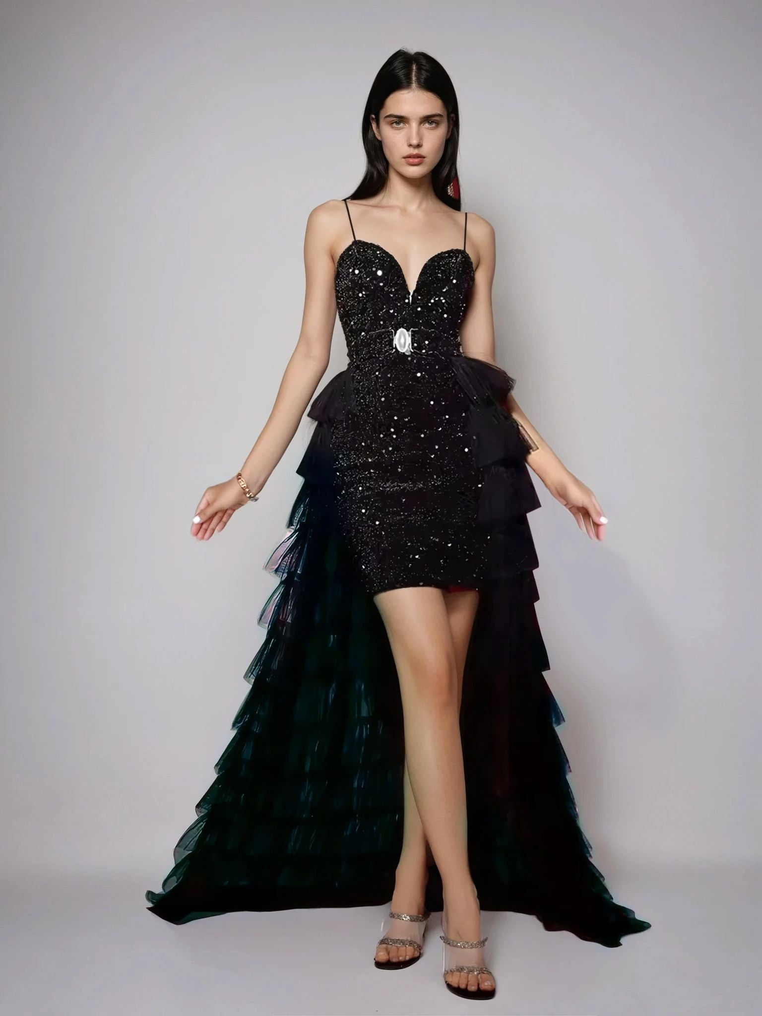 Elevate your evening look with this black strapless sequin patchwork dress, featuring a luxurious tulle mesh overlay for a touch of elegance and sophistication.  Perfect for formal events, parties or special occasions.  This dress combines shimmering sequins with a flowy mesh design to create a stunning silhouette. The strapless neckline enhances the allure, making it a must-have for women who love glamorous and refined fashion.  Pair it with high heels and minimal jewelry for a show-stopping look.